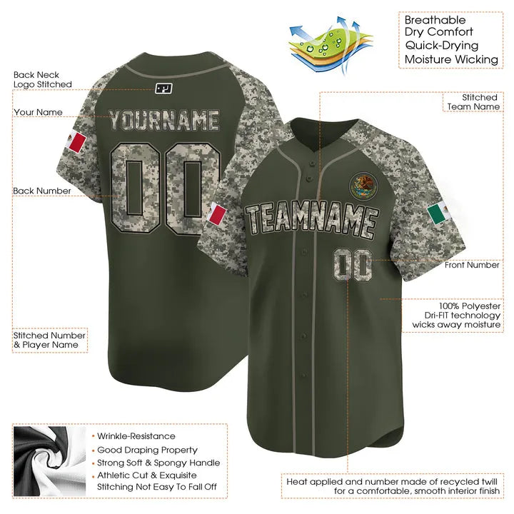 CUSTOM ALTERNATE OLIVE GREEN CAMO - BLACK MEXICO BASEBALL JERSEY - EMBROIDERED
